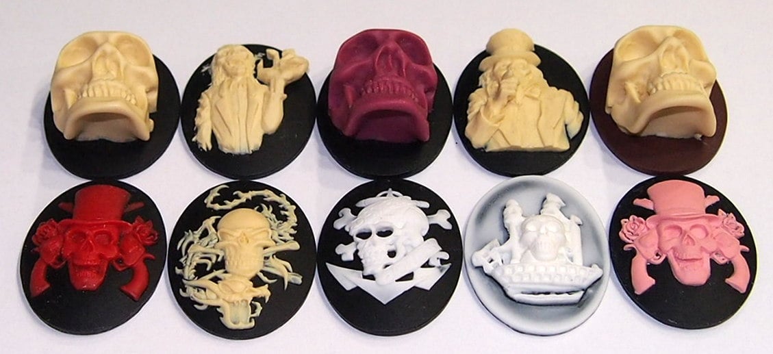 You are buying 10 Different Molded Resin Cameos. These are Gothic Skulls & Zombies in all color schemes. Exactly what you see is what you will receive. These are very detailed and All my cameos have never been used. The molding process of these are just great, no flaws. These are pretty fabulous. They measure 40 mm x 30 mm. I have lots of great cameos, settings and pendants so, just look at all my listings. If you have been looking at our products & wanted to try some but, didn't want to buy a lot of the same one, here is your chance to sample an assortment at a Great price.