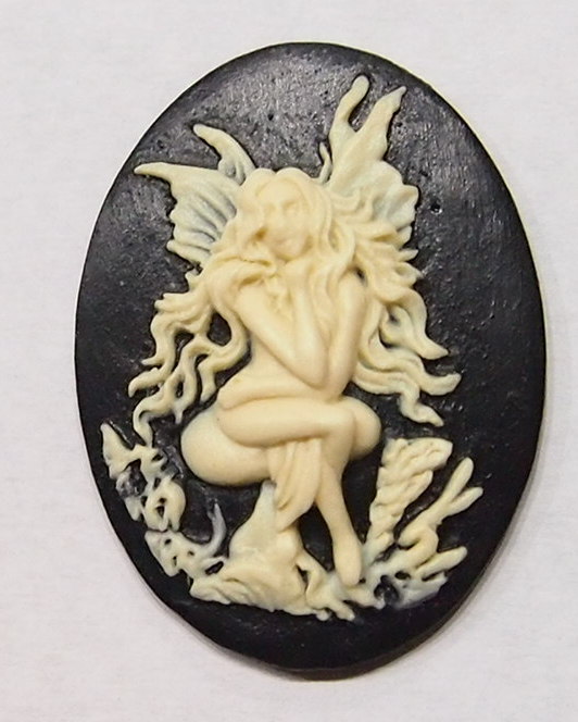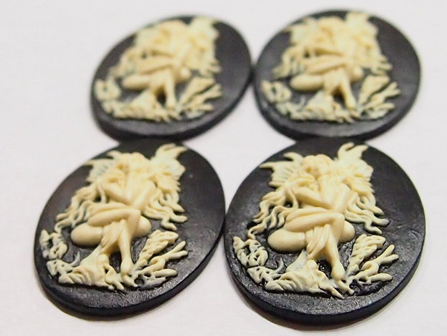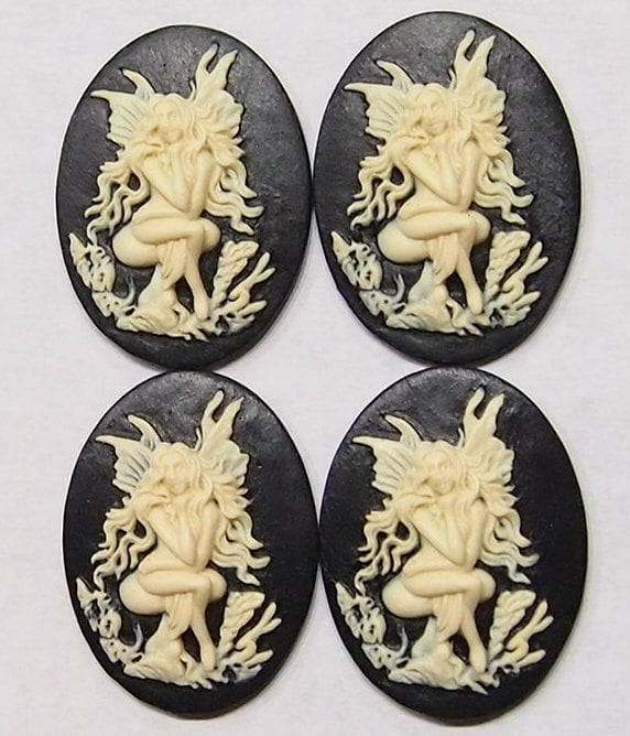 You are buying 4 Molded Resin Cameos. These are so gorgeous, this shows a beautiful lady fairy sitting on a Mushroom or ToadStool in a floral design, just too cute in a Ivory color on a Black background. These are very detailed and All my cameos have never been used. The molding process of these are just great, no flaws. These are pretty fabulous. They measure 40 mm x 30 mm. I have lots of great cameos, settings and pendants so, just look at all my listings. I have thousands of items to list