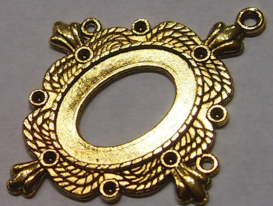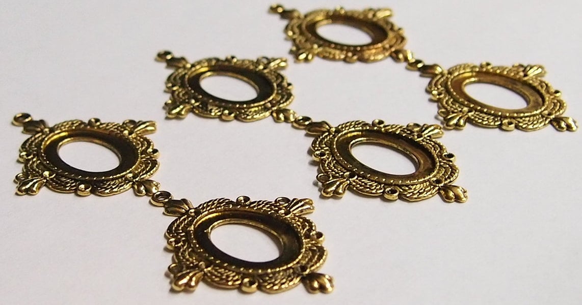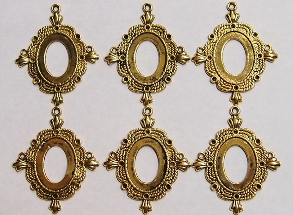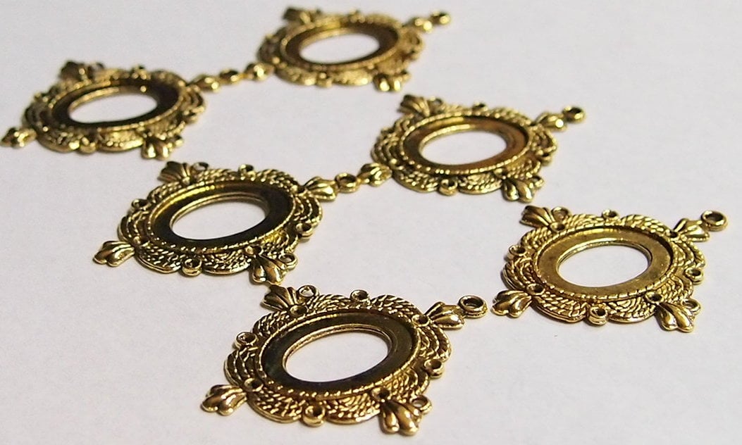 You are buying 6 of 25 mm x 18 mm Pendant Settings, these are Antique Gold Plated, they are a Glue in setting and are very sturdy. They have a triple twisted rope design with a crown on each corner around the pendant. These have never been used. These are exactly made for 25 mm x 18 mm, no other size will fit. Everything is solidly made from the setting to the pendant bail. They have a gorgeous Victorian look to them and I believe these are very flattering for cameos. I have lots of great cameos, settings and pendants so, just look at all my listings.