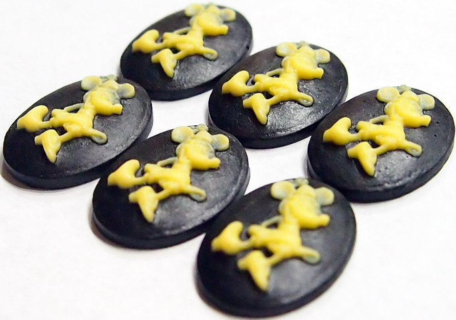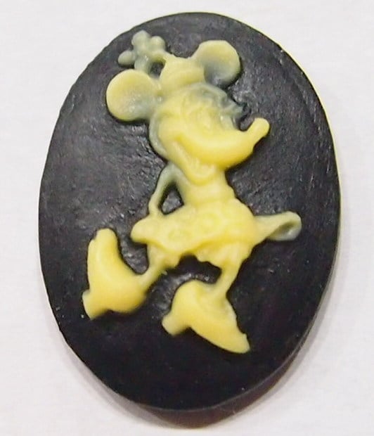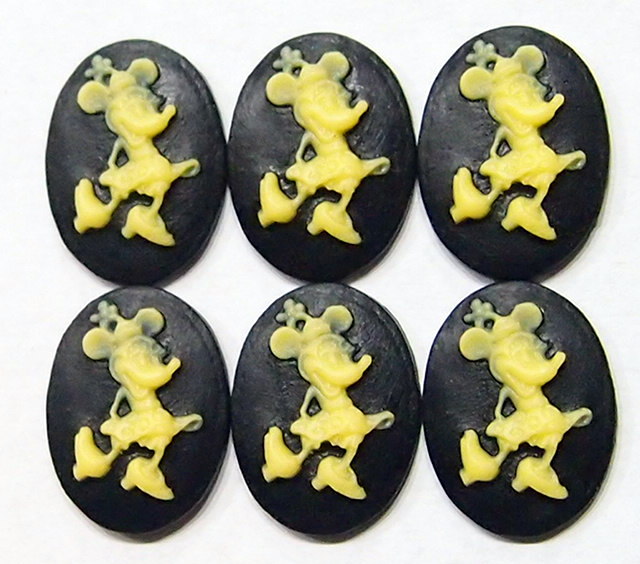 You are buying 6 Molded Cameos. These are so gorgeous, this shows Minnie Mouse, all dressed up to the hilt, with fake eyelashes and a pretty dress . This is a new cameo, not vintage and is very unique, no flaws and they are a dark cream color over a black background. I have several different settings these will fit in. They fit into the 25 mm x 18 mm settings I have listed. These are pretty fabulous. They look very detailed for their size. I have a lot of settings and old cameos, so check my other listings.