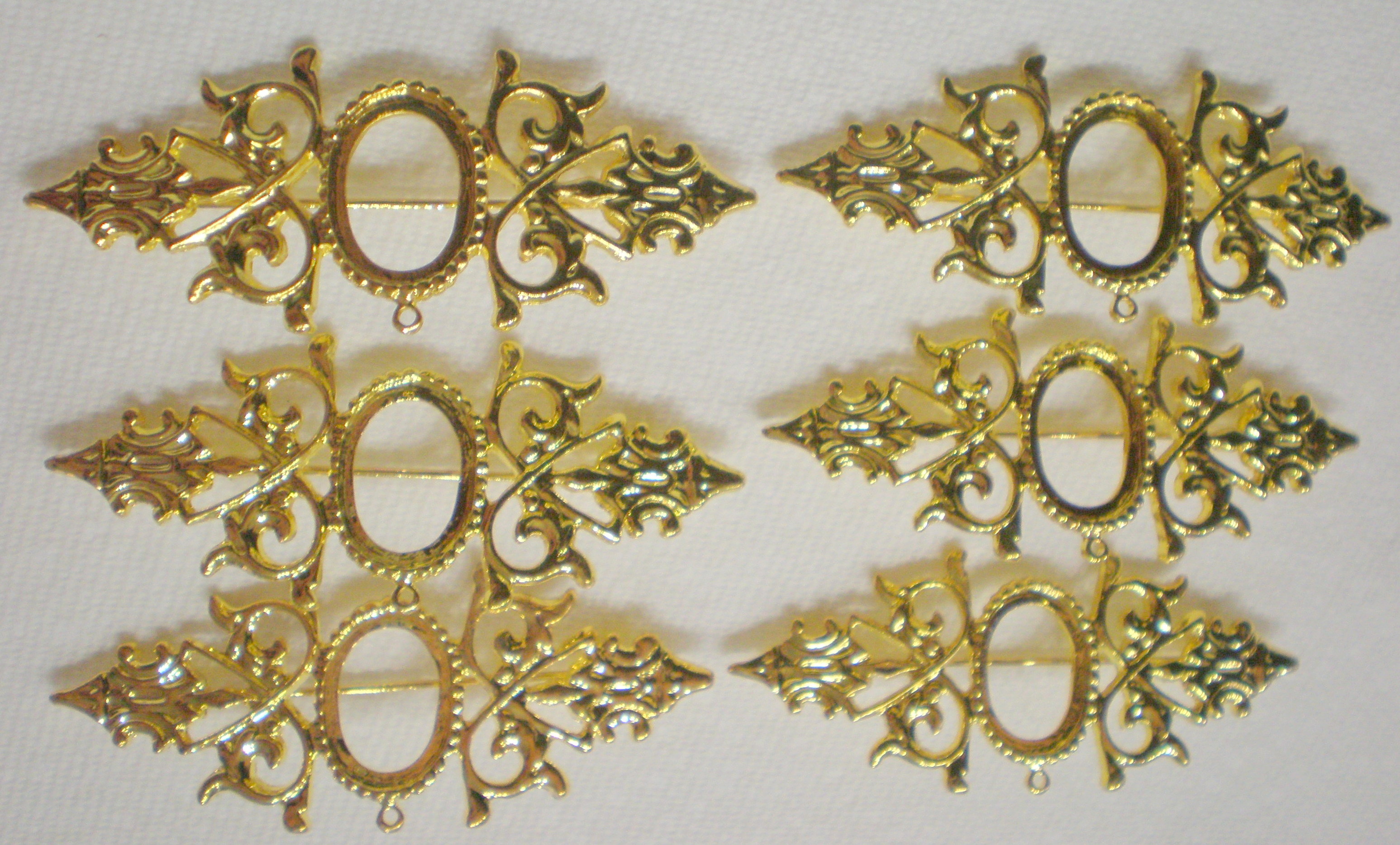 You are buying 6 of 18 mm x 13 mm Pin Setting, these are Shiny Gold in color. These settings are originally from the 1900-1930's. These have a pin setting near the top. The design is just delicate, but they are very solid, not flimsy like the new ones are. You will not be disappointed in the quality, it is excellent and if I was setting old cameos, I would use these. It has a locking pin. These will work great for any cameos or cabs, they will have to be glued in. I have a lot of Great settings, pendants, and old cameos, I will be listing, so check my other items.