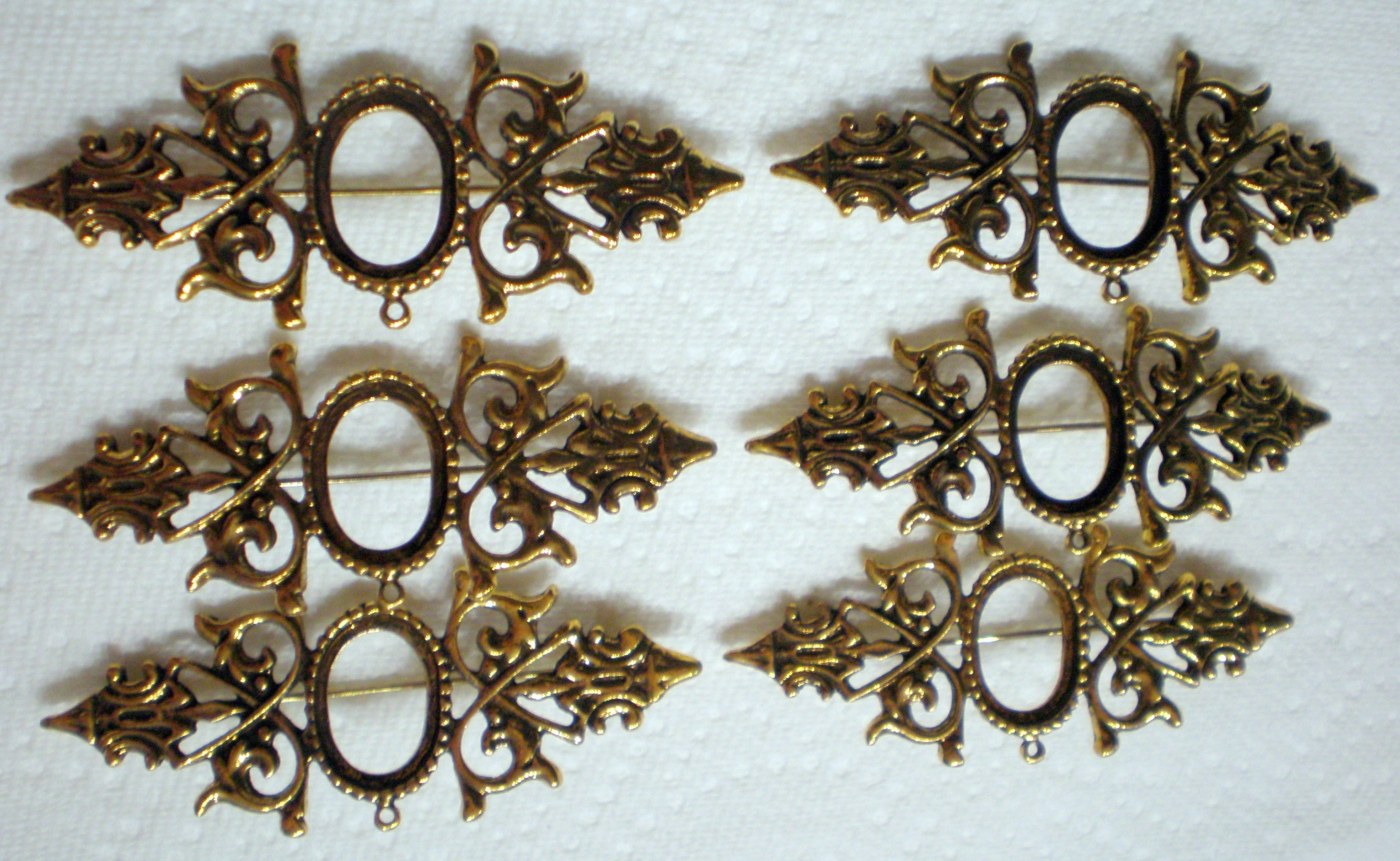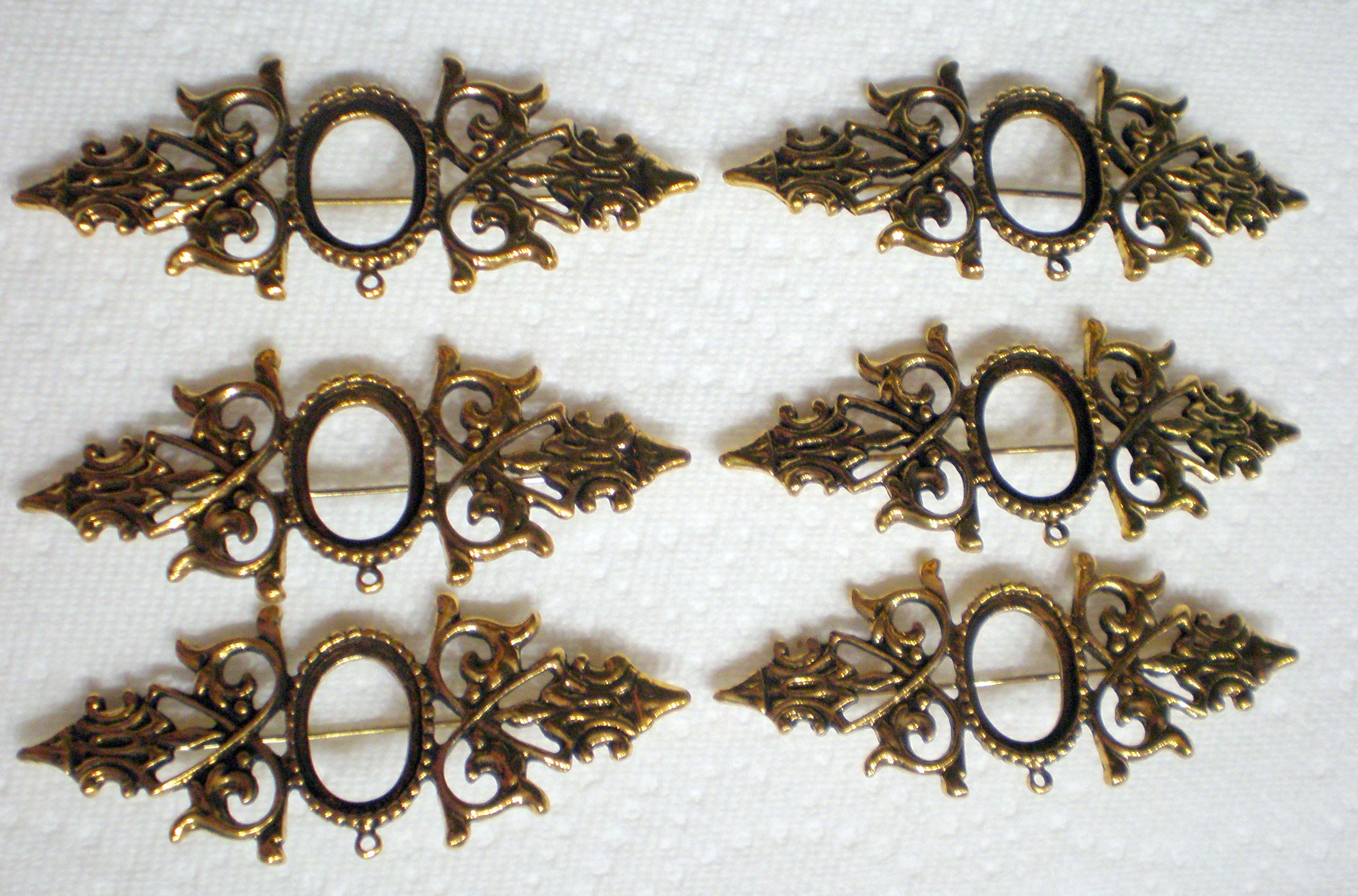You are buying 6 of 18 mm x 13 mm Pin Setting, these are Antique Gold in color. These settings are originally from the 1900-1930's. These have a pin setting near the top. The design is just delicate, but they are very solid, not flimsy like the new ones are. You will not be disappointed in the quality, it is excellent and if I was setting old cameos, I would use these. It has a locking pin. These will work great for any cameos or cabs, they will have to be glued in. I have a lot of Great settings, pendants, and old cameos, I will be listing, so check my other items.