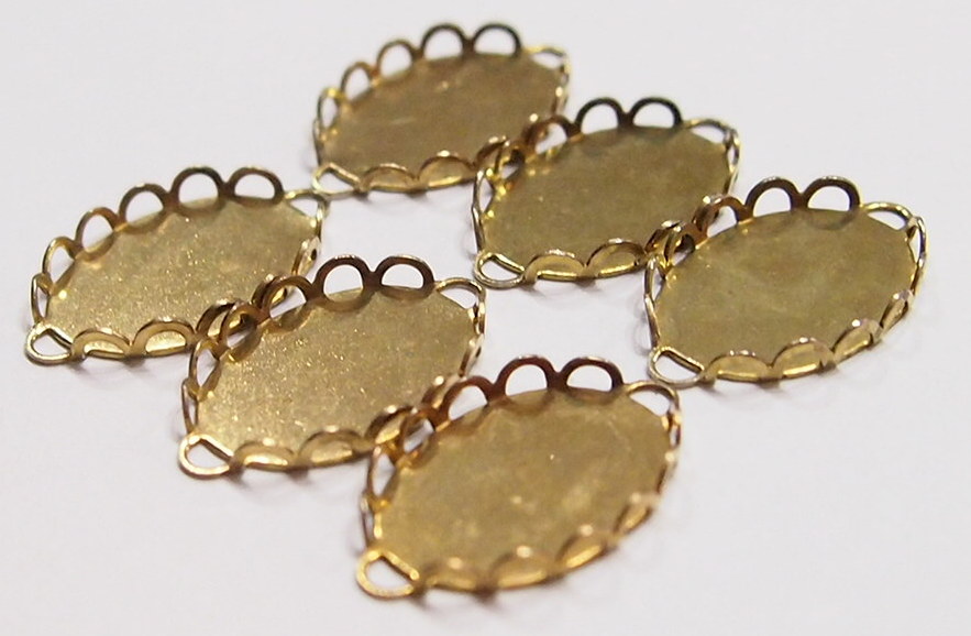 You are buying 6 of 18 mm X 13 mm Oval Pendant Settings, these are Brass plated, You can glue or use the loops to hold in any cameos or cabs you want to put into the settings. Each end has a plate to connect jumprings, you could make this just into a pendant or even bracelets if you want to or earring. This will hold 18 mm x 13 mm cabs or cameos, and have never been used. These are exactly made for 18 mm x 13 mm, but with this being a solid backing, you can go down a little on the size is you have a strange size to try and fit. Everything is solidly made. I have lots of great cameos, settings and pendants so, just look at all my listings.