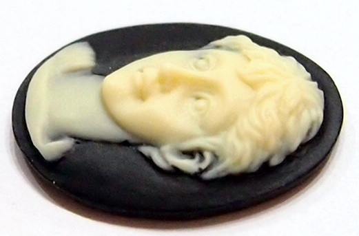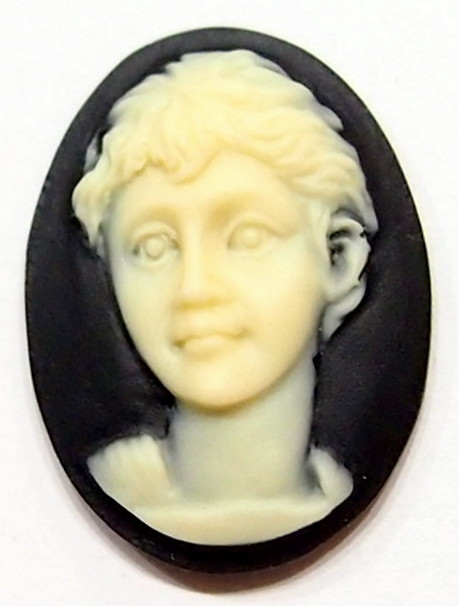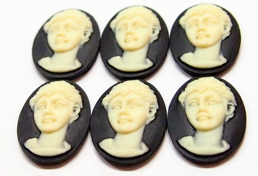 You are buying 6 Vintage Resin Cameos. These are so cute, this shows a young girl with her looking more like a portrait with her short hair. She is unique, no flaws and never has been used. She is an ivory over a black background. I have several different settings these will fit in to. They measure 25 mm x 18 mm. They look very detailed for their size. I have a lot of settings and old cameos, so check my other listings.