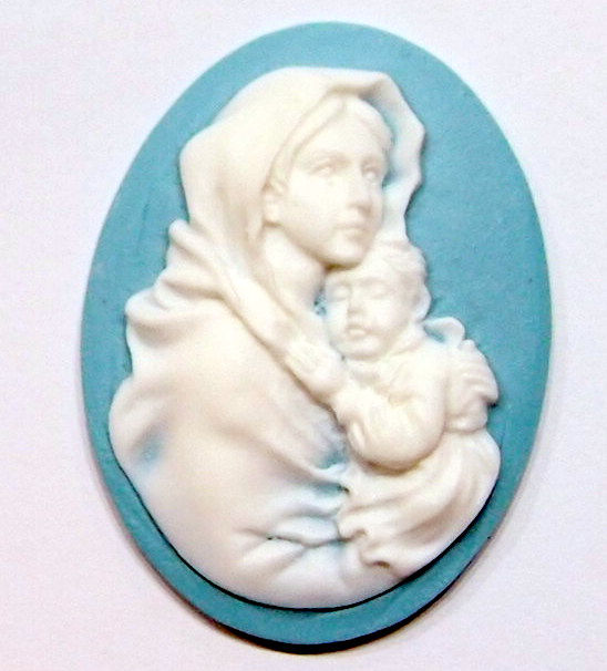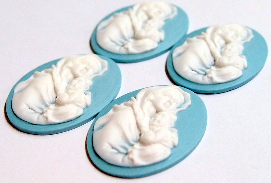 You are buying 4 Vintage Molded Resin Cameos. They are of the Beautiful Virgin Mary with baby Jesus, held tight to her shoulder, these are molded. The images stands out from the cameo to give you the 3-d effect. They are a White color to a Baby Blue color background. They measure 40 mm x 30 mm. These are simply gorgeous and show Mary cradling her Jesus. They look very detailed for their size. I have lots of great cameos, settings and pendants so, just look at all my listings.