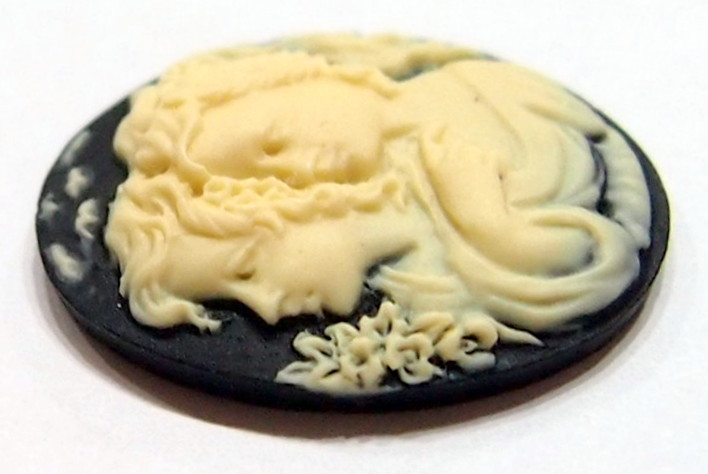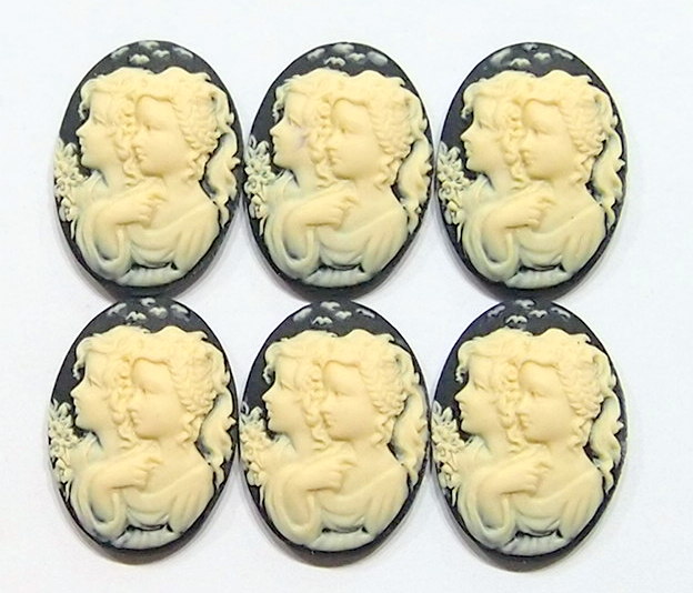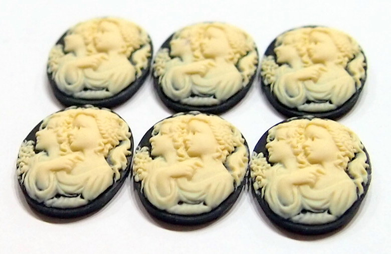 You are buying 6 vintage Molded Cameos. They are of Sisters or Mother & Daughter, either one, the molding is very well done. They are a gorgeous Cream on Black background. They measure 25 mm x 18 mm. These are vintage but never used. All my cameos have never been used. They look very detailed for their size, in fact, they stand out from the background to give it a 3-D look. I have lots of great cameos, settings and pendants so, just look at all my listings.