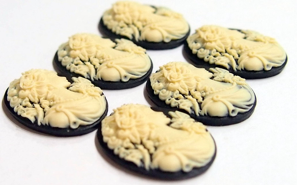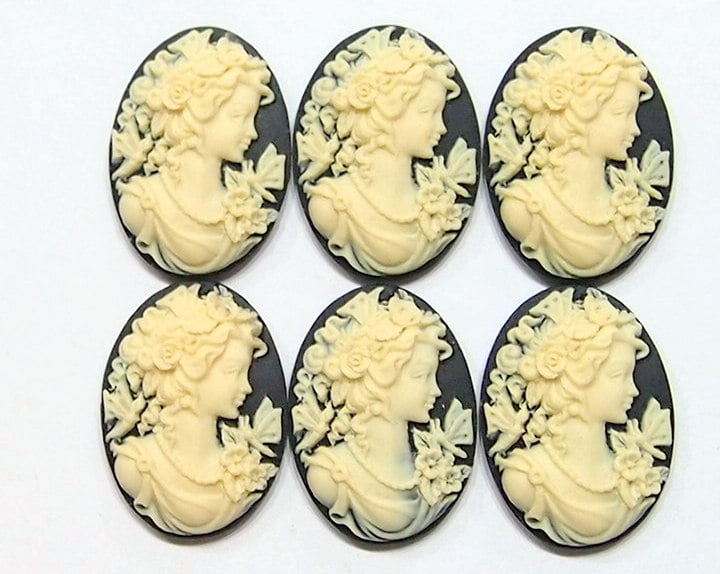 You are buying 6 Vintage Molded Resin Cameos. These are so gorgeous, this shows a beautiful Mythology Muse Or Grecian woman in a gown with her hair up and her hairband is all floral with roses and there are two butterflies on both sides of her. She is wearing a pearl necklace and her gown has a floral accent too, they are perfect. The woman is Cream over a Black color background. The molding process of these are just great, no flaws. These measure 25 mm x 18 mm. I have several different settings these will fit in. These are pretty fabulous. They look very detailed for their size. I have lots of great cameos, settings and pendants so, just look at all my listings.